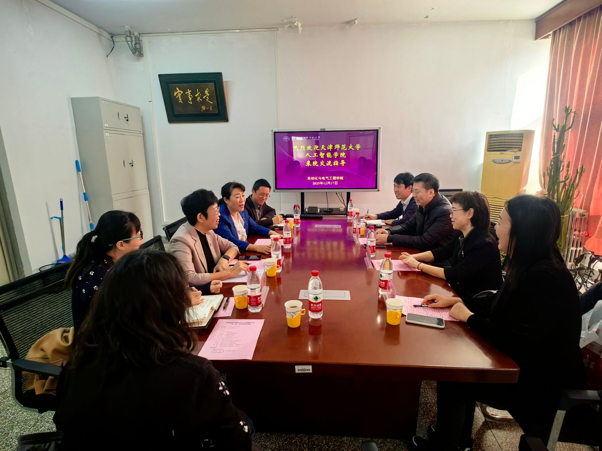为深化校际合作、推动教育资源共享,12月17日,天津职业技术师范大学与天津师范大学“三校一院”合作交流会在天津职业技术师范大学自动化与电气工程学院圆满举行。天津职业技术师范大学党委副书记李靖,天津师范大学人工智能学院党委书记杨庆、院长张宝菊、副院长张博、学工办主任田添,天津职业技术师范大学自动化与电气工程学院党委书记吴平、院长王冬霞、人工智能系主任杨丽、学工办主任王超等双方代表出席本次交流会。