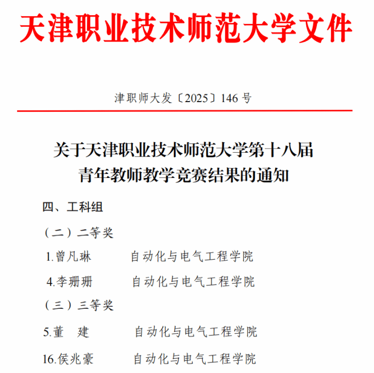 近日,天津职业技术师范大学第十八届青年教师教学竞赛圆满落幕。我院青年教师在此次竞赛中表现优异,斩获多项荣誉。教师曾凡琳、李珊珊获工科组二等奖,董建、侯兆豪获工科组三等奖,充分展现了我院青年教师扎实的教学功底和卓越的教学风采。