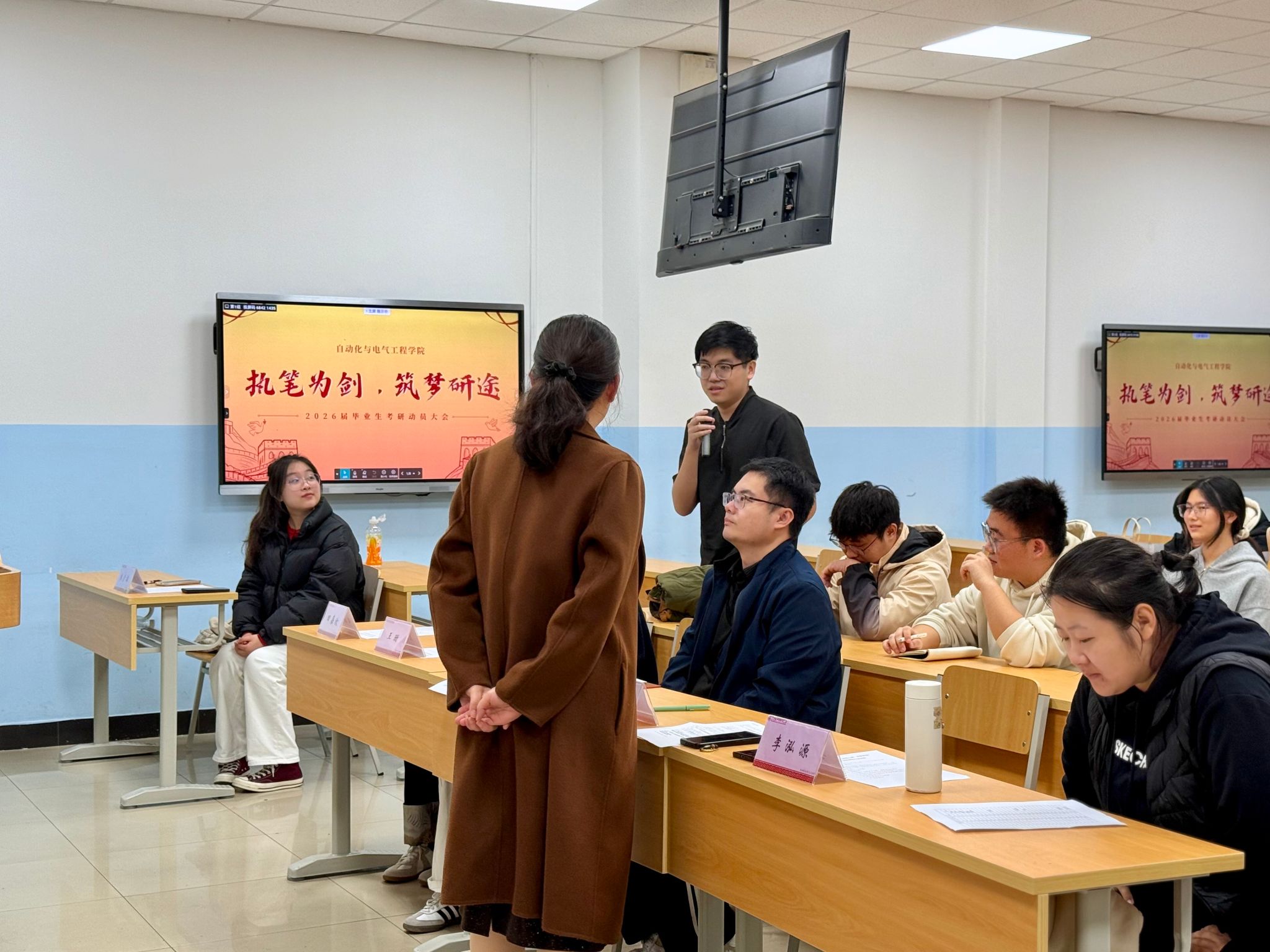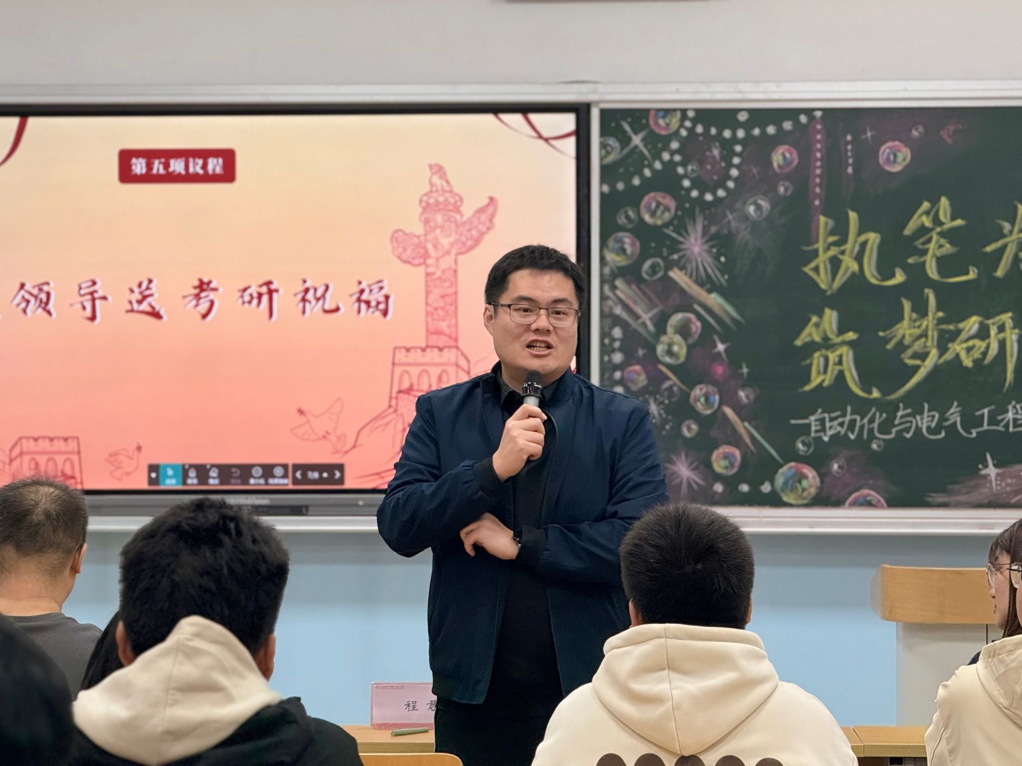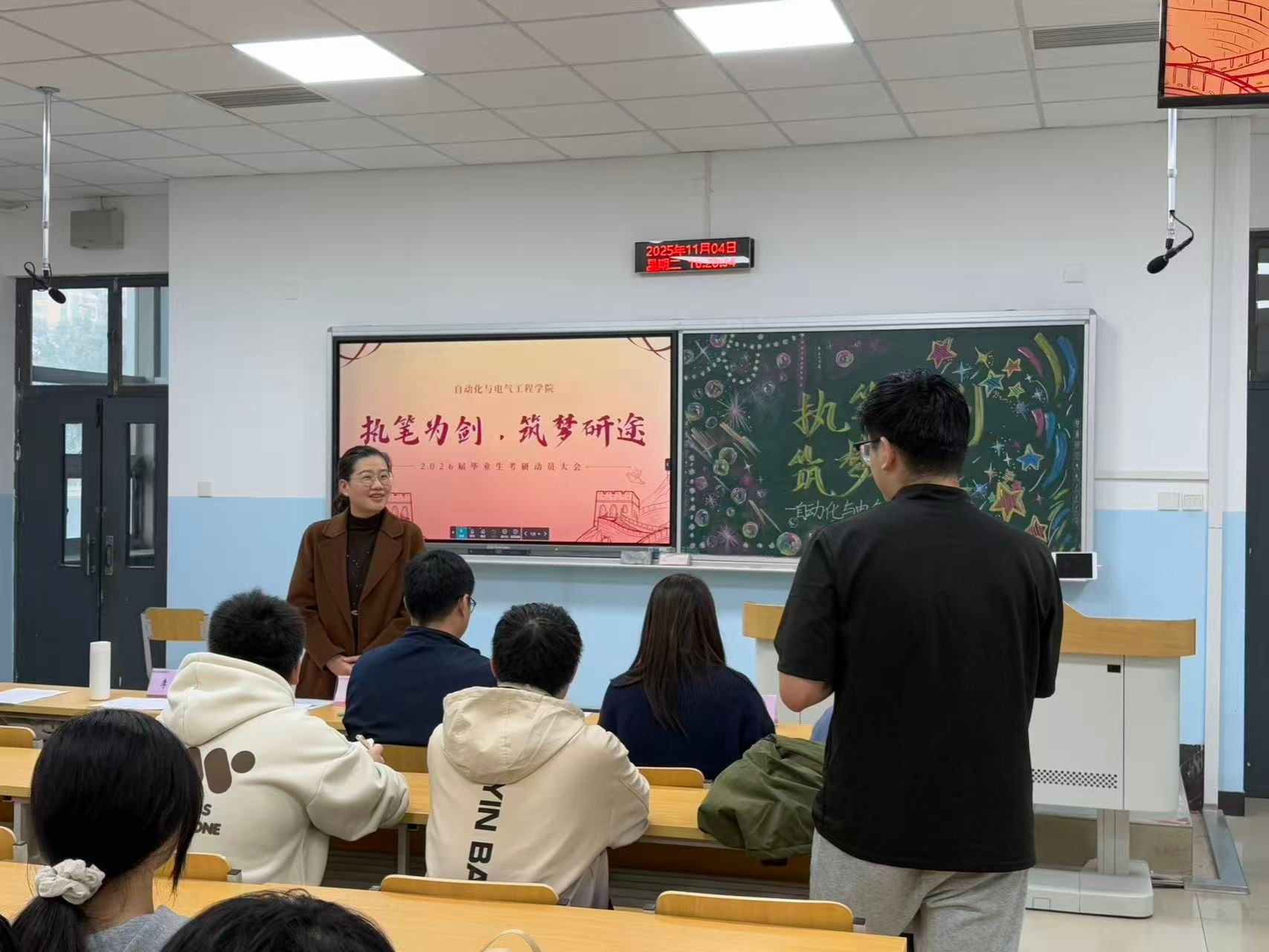 为精准对接考研学子需求,明晰备考方向,缓解心理压力,11月4日,自动化与电气工程学院在二教207召开“执笔为剑,筑梦研途”2026届考研学生慰问活动。院党委副书记程君,副院长董建代表学院领导班子莅临现场对考研学子进行慰问,辅导员田嘉欣、丁俊伍、李泓源、王珊,研究生代表朱彦洁及2026届考研毕业生代表参与本次活动。