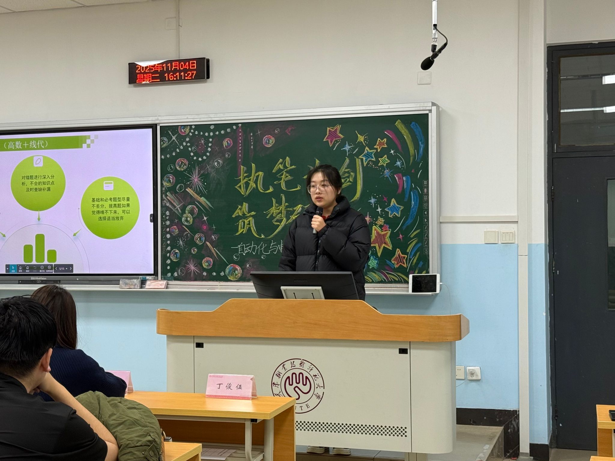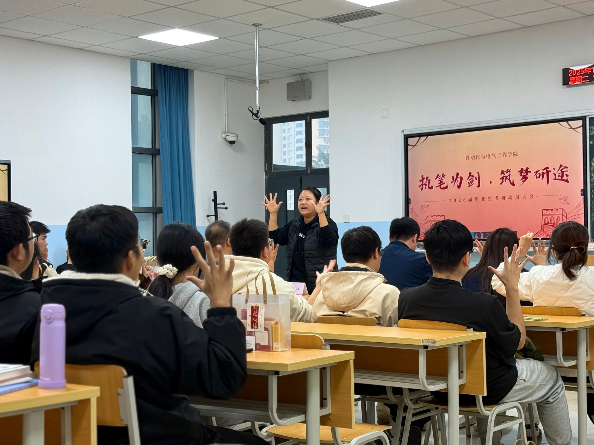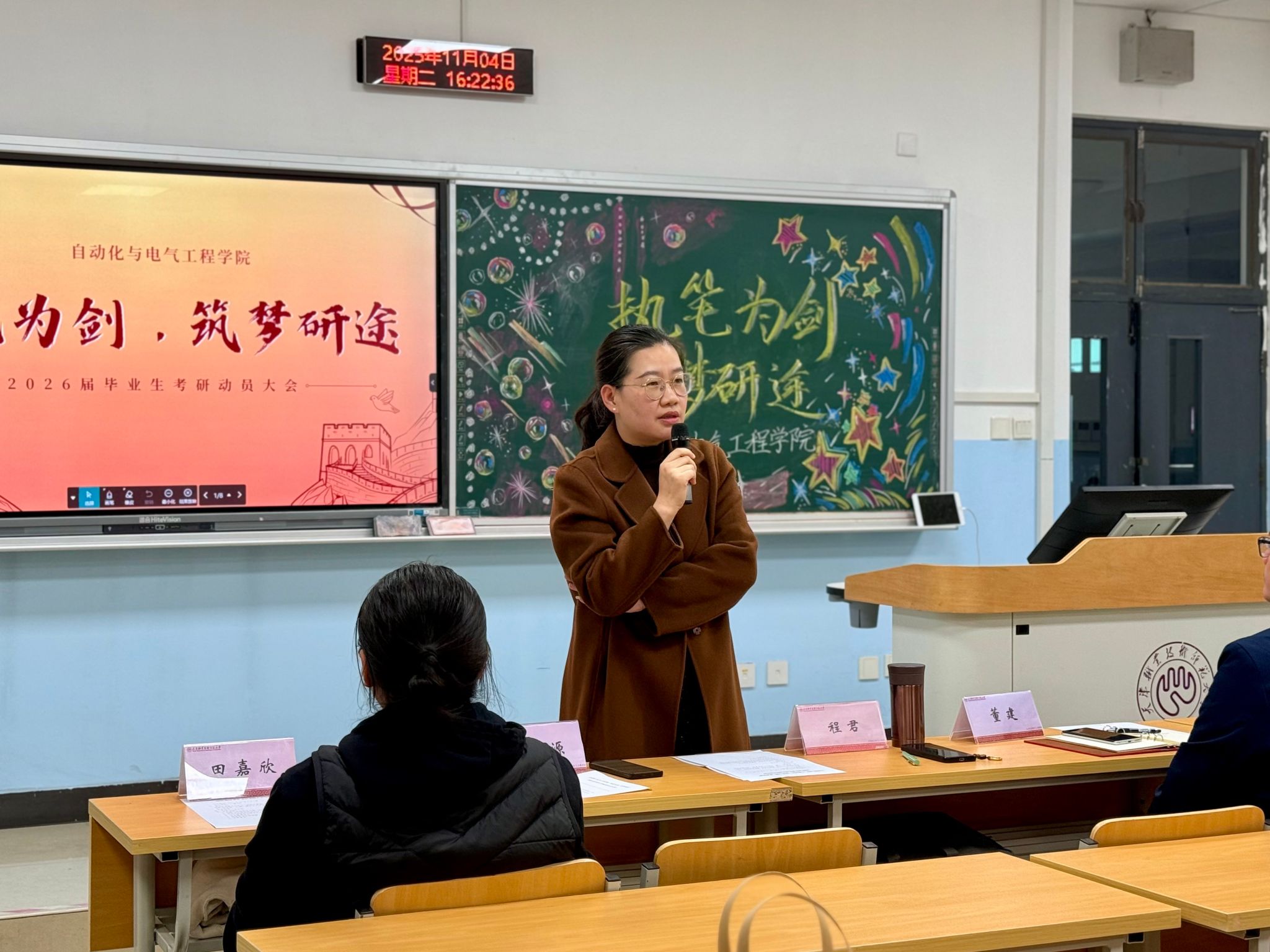 为精准对接考研学子需求,明晰备考方向,缓解心理压力,11月4日,自动化与电气工程学院在二教207召开“执笔为剑,筑梦研途”2026届考研学生慰问活动。院党委副书记程君,副院长董建代表学院领导班子莅临现场对考研学子进行慰问,辅导员田嘉欣、丁俊伍、李泓源、王珊,研究生代表朱彦洁及2026届考研毕业生代表参与本次活动。