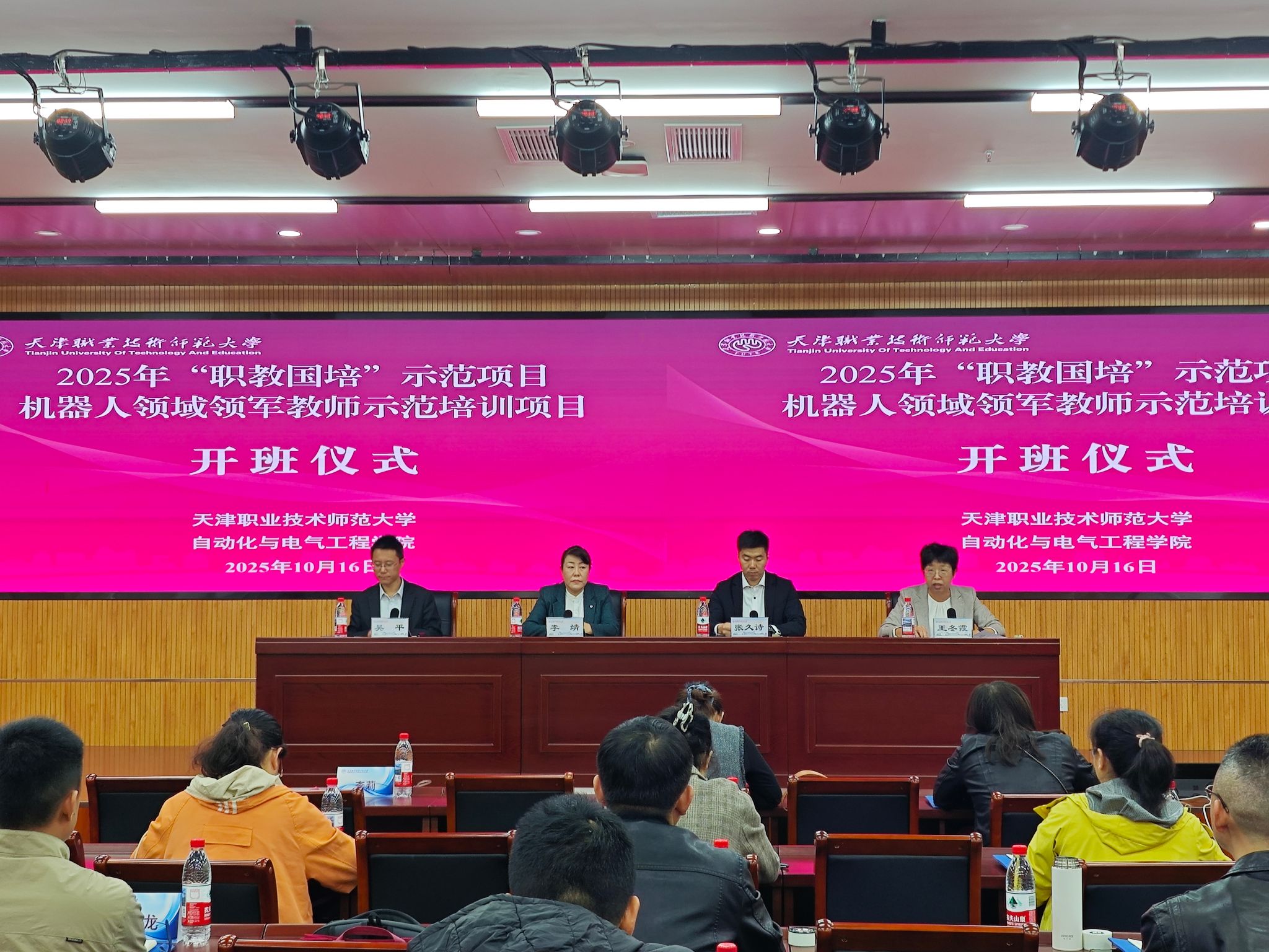 10月16日,2025年“职教国培”示范项目机器人领域领军教师示范培训项目在天职师大开班。校党委副书记李靖出席开班仪式并致辞。成人教育部主任(继续教育学院院长)张久诗,培训班承办单位自动化与电气工程学院党委书记吴平、院长王冬霞和来自全国高职院校的50名机器人领域领军教师学员参加开班仪式。开班式由王冬霞主持。