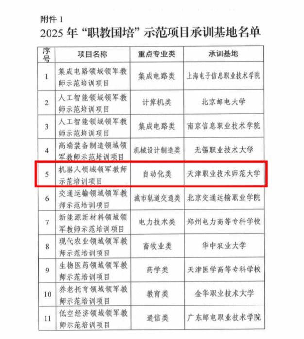 “职教国培”示范项目是教育部教师工作司领导下,面向国家级职业教育“双师型”教师培训基地申报的国家级培训项目。项目聚焦教育强国建设对教师队伍建设的新要求,围绕国家战略和重点紧缺领域专业,集聚优势力量,集中培育和打造一批职业院校专业领军教师,建设一批优质的数字培训资源,发挥辐射引领作用,推动相关领域发展和专业建设。2025年共有全国118家基地参与此次项目申报,最终11家单位成功获批。其中我校自动化与电气工程学院申报的“机器人领域领军教师示范培训项目”,在12家同类竞争单位中成功突围,成为自动化类机器人领域内唯一一家获批单位。