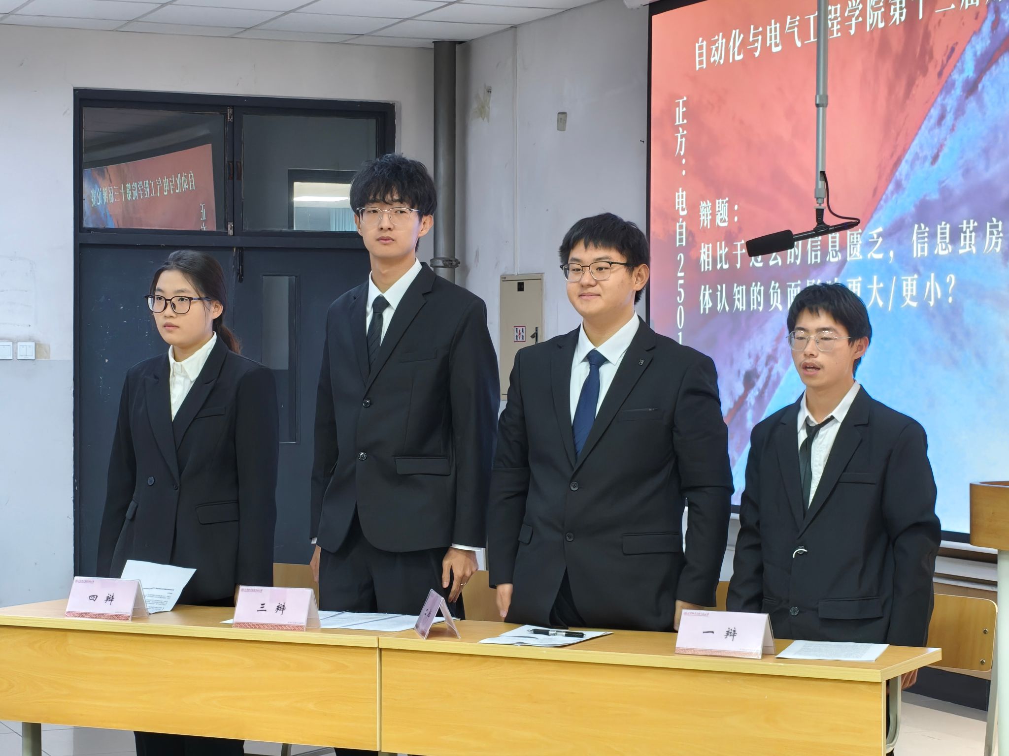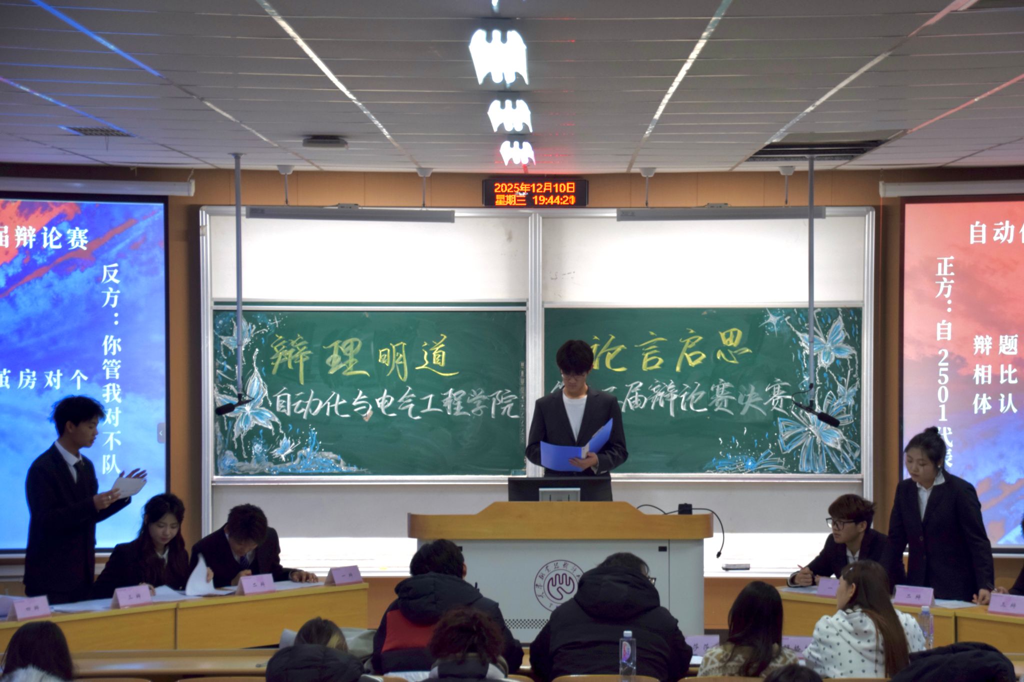 为丰富校园文化生活,锻炼学生逻辑思辨与语言表达能力,营造勤于思考、乐于思辨的良好氛围,12月10日,自动化与电气工程学院举行“辩理明道,论言启思”第十三届辩论赛决赛。本次决赛邀请学院辅导员李泓源,哲思鸣辩社副会长文玉、副会长兼校辩论队教练汪莎莎及校辩论队队员解格格、祁令琛共同担任比赛评审。